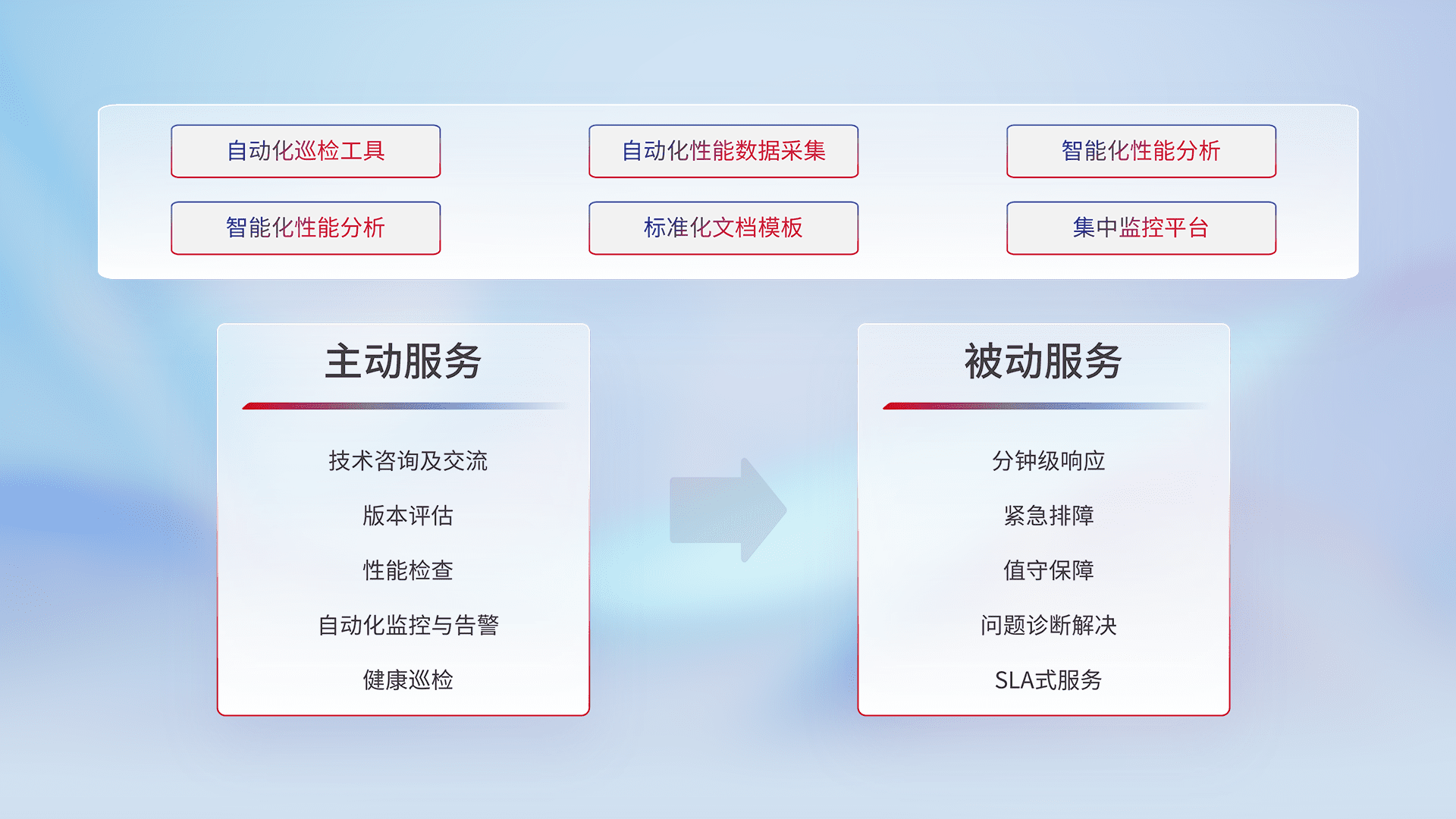 智能化工具和标准化文档,,保障服务质量,,,,提供主动服务(包含技术咨询、、版本评估、、、、性能检查、、自动化监控与告警、、健康巡检)和被动服务包含(分钟级响应、、、、紧急排障、、、值守保障、、、、问题诊断解决、、、SLA服务)。。。