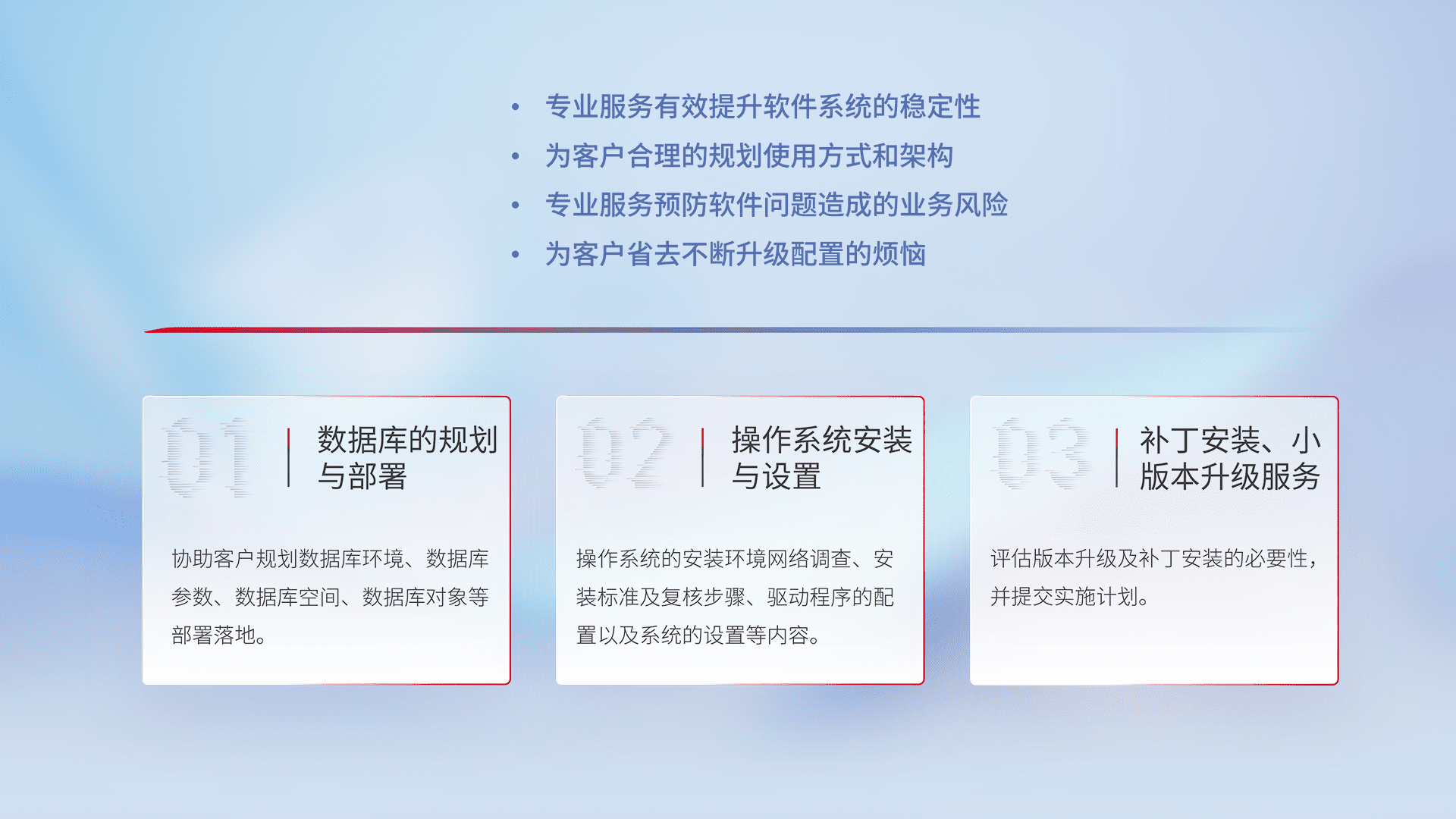 为客户提供软件规模升级、、、、快速部署、、、按需配置的专业服务,,从数据库的规划与部署到操作系统的安装与设置,,再到补丁安装和小版本升级提供支持。。。。